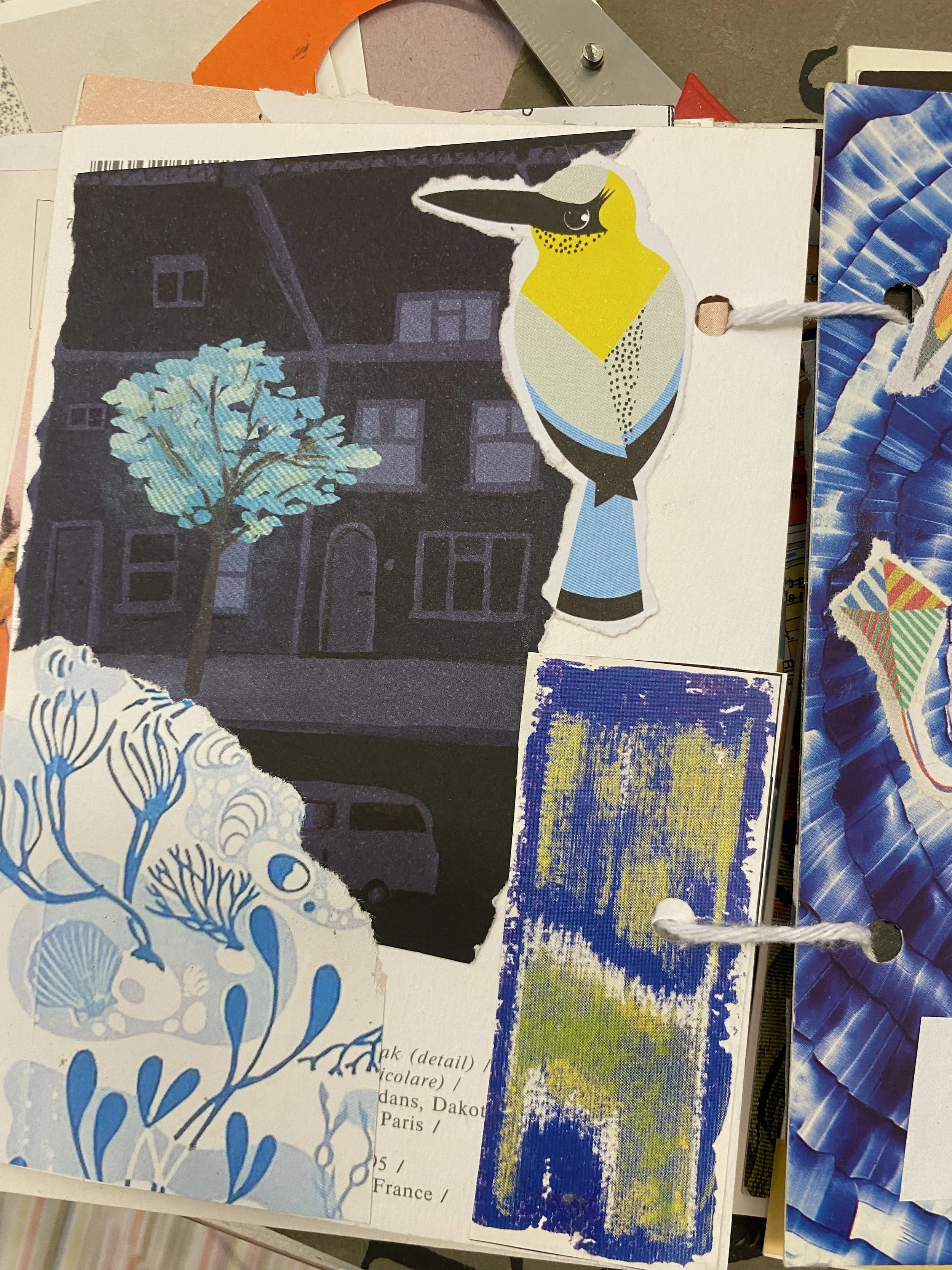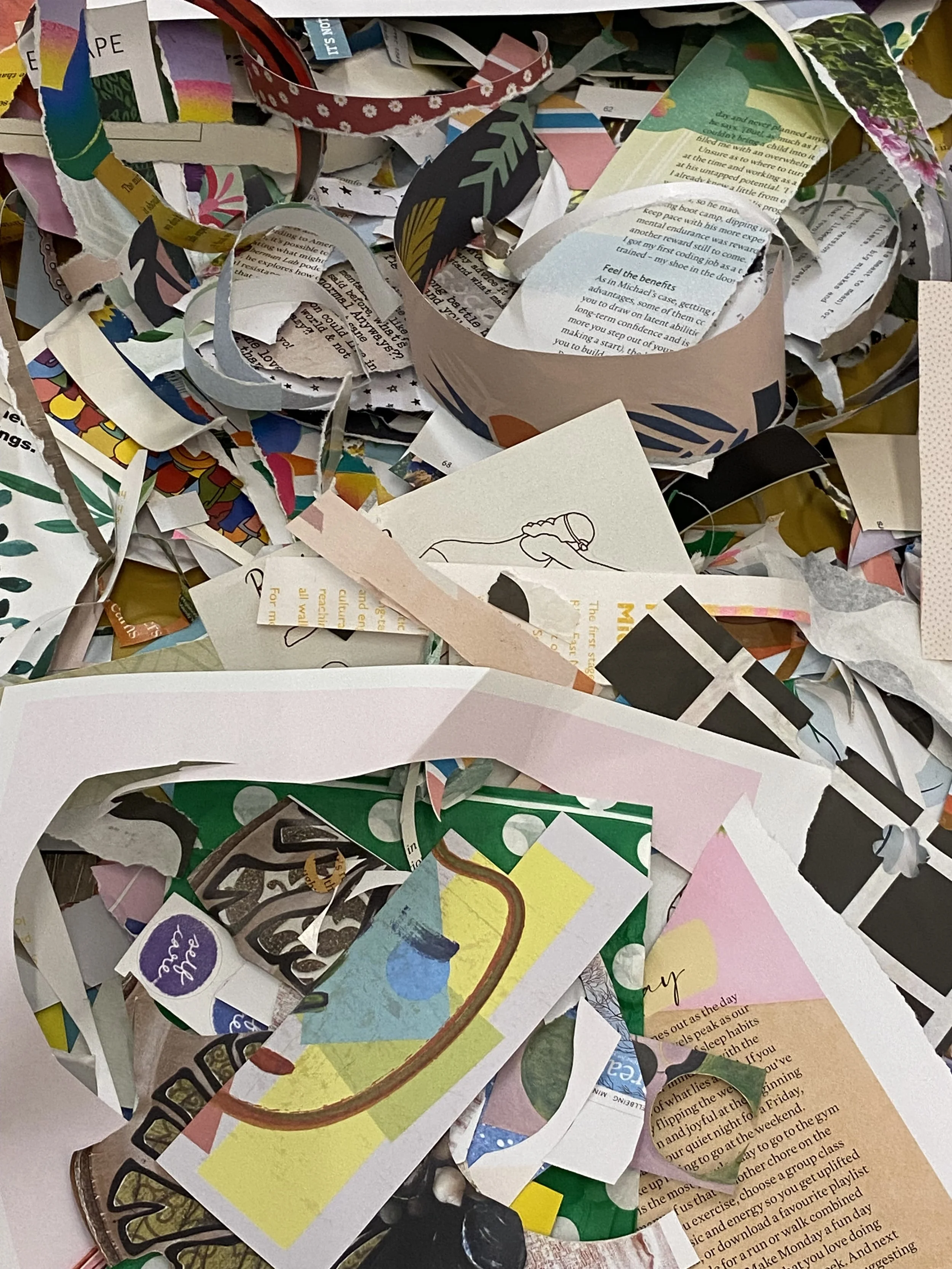 Once you’ve got a collection together, take a look at your pieces and notice how they interact. Are there lines, corners, edges or colours that go together nicely? Do you prefer contrast or harmony? What happens if you tear, fold, scrunch, or scribble on them? What stands out?